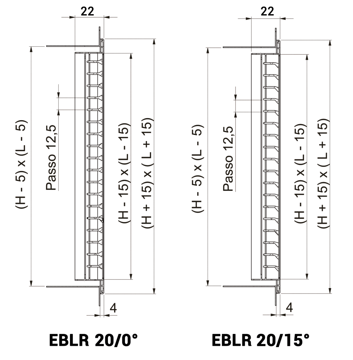 | dimensioni | bocchette EBLR 20/0° | bocchette EBLR 20/15° |