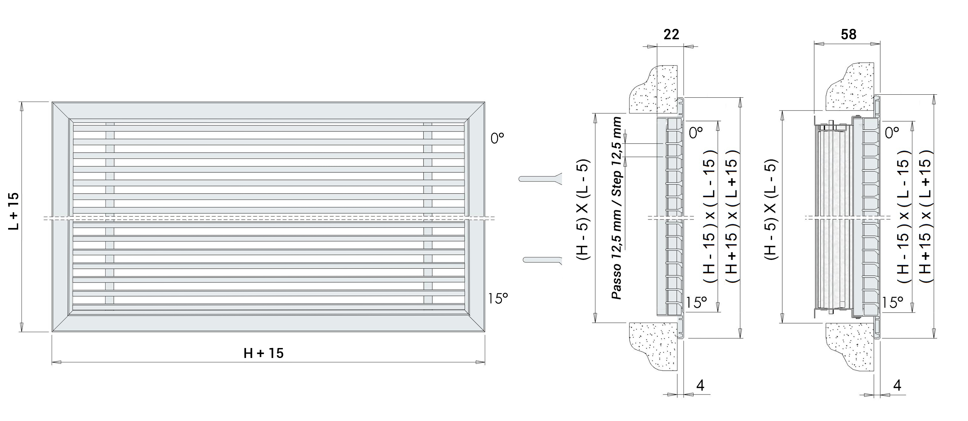 Bocchette a barre orizzontali fisse in alluminio con profili a deflessione 0° o 15°, con cornice 15 mm.
