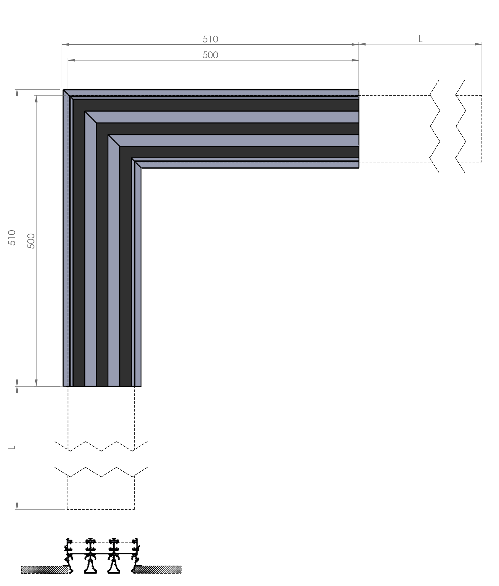 Elemento estetico di raccordo tra i due linee di diffusori lineari con angolo di 90° e lunghezza 500 mm per lato. Non ha funzionalità di ventilazione.