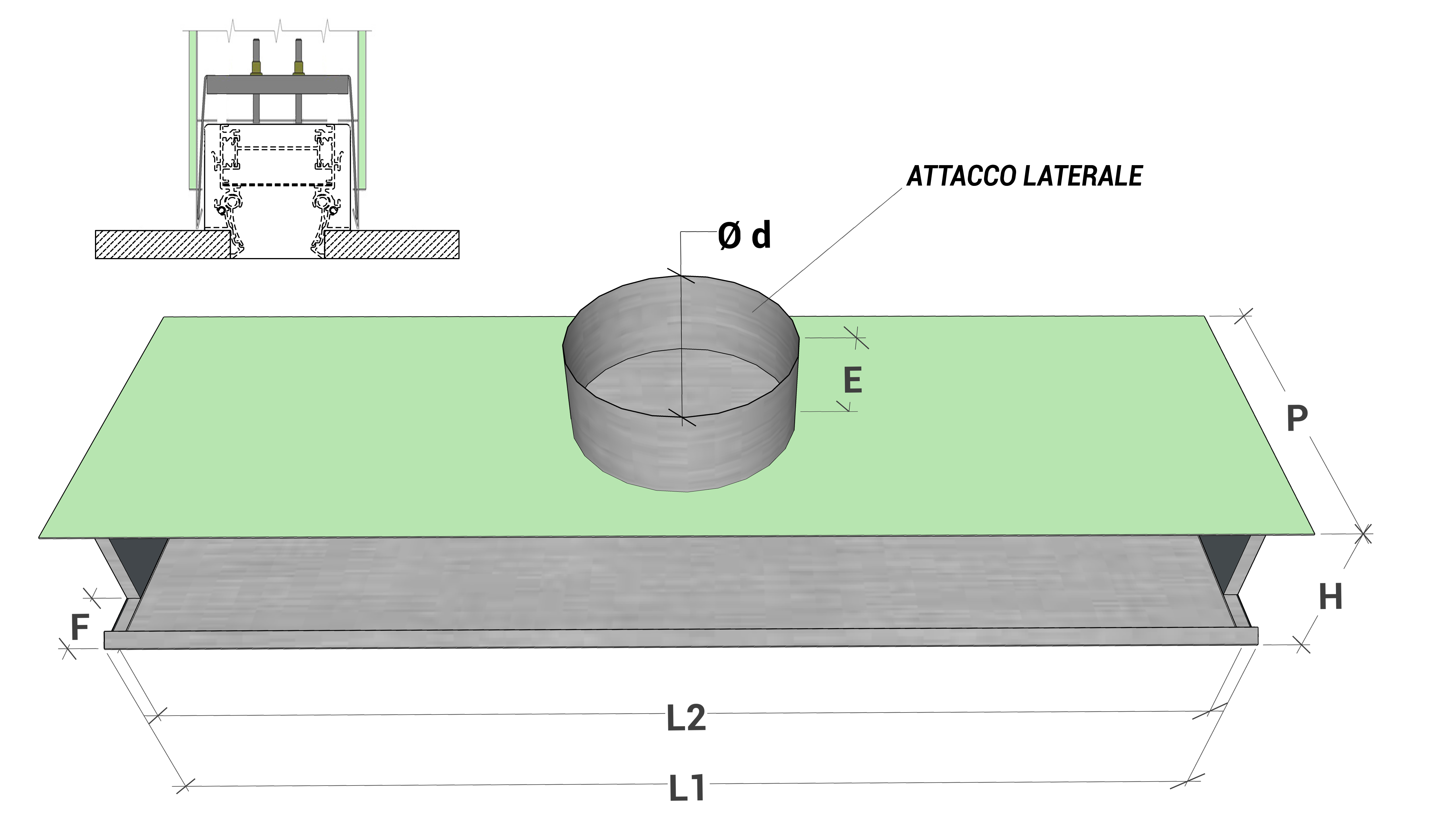 Dimensioni plenum e sistema di montaggio con ponti di fissaggio