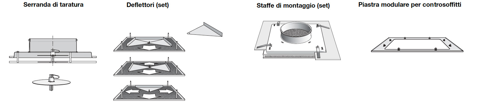 - piastra per controsoffitti per installare il diffusore su controsoffitto modulare 600mm x 600mm.