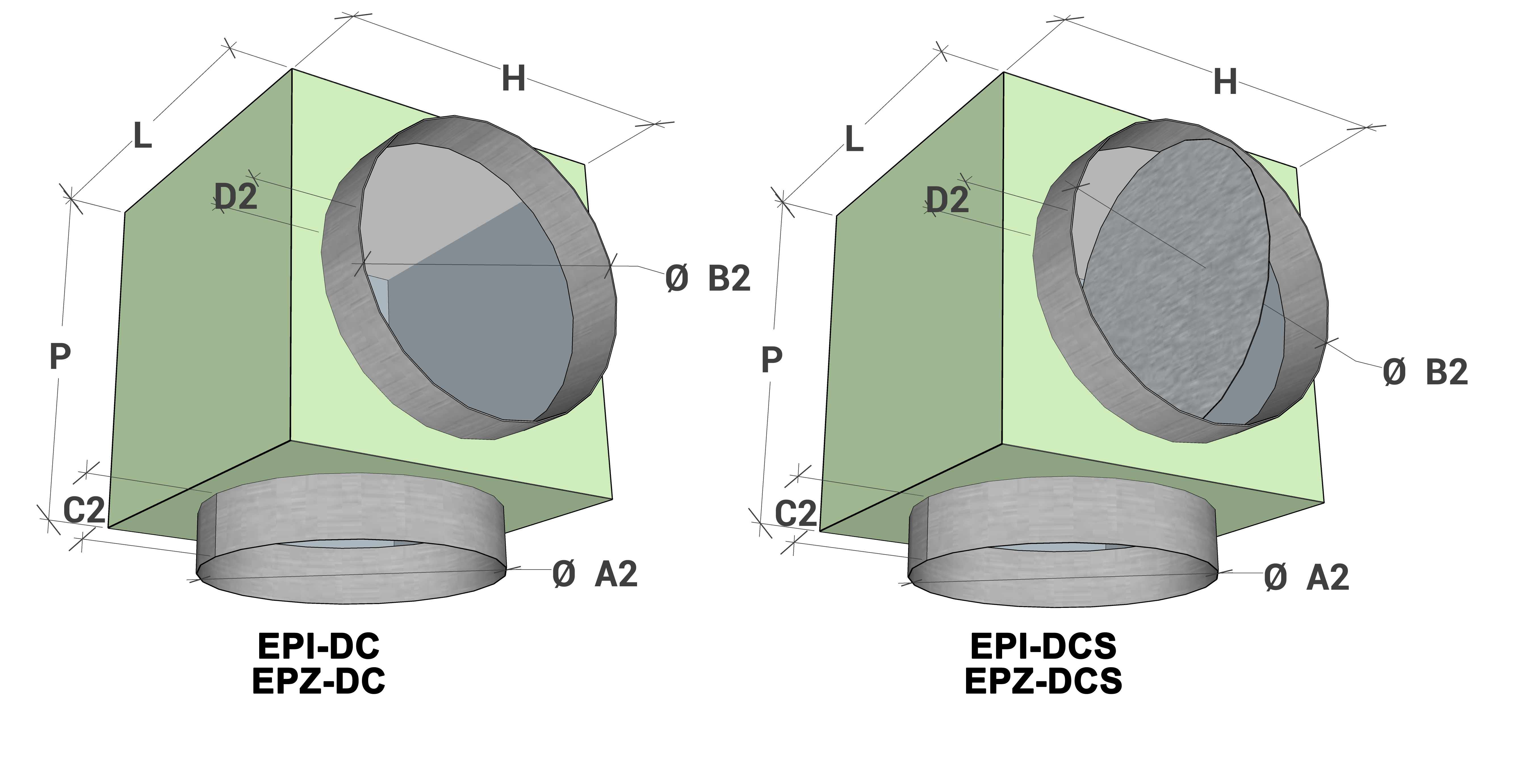 | Modello | L | H | P | ØA2 Diffusore | ØB2 Tubo flessibile o rigido | C2 | D2 |