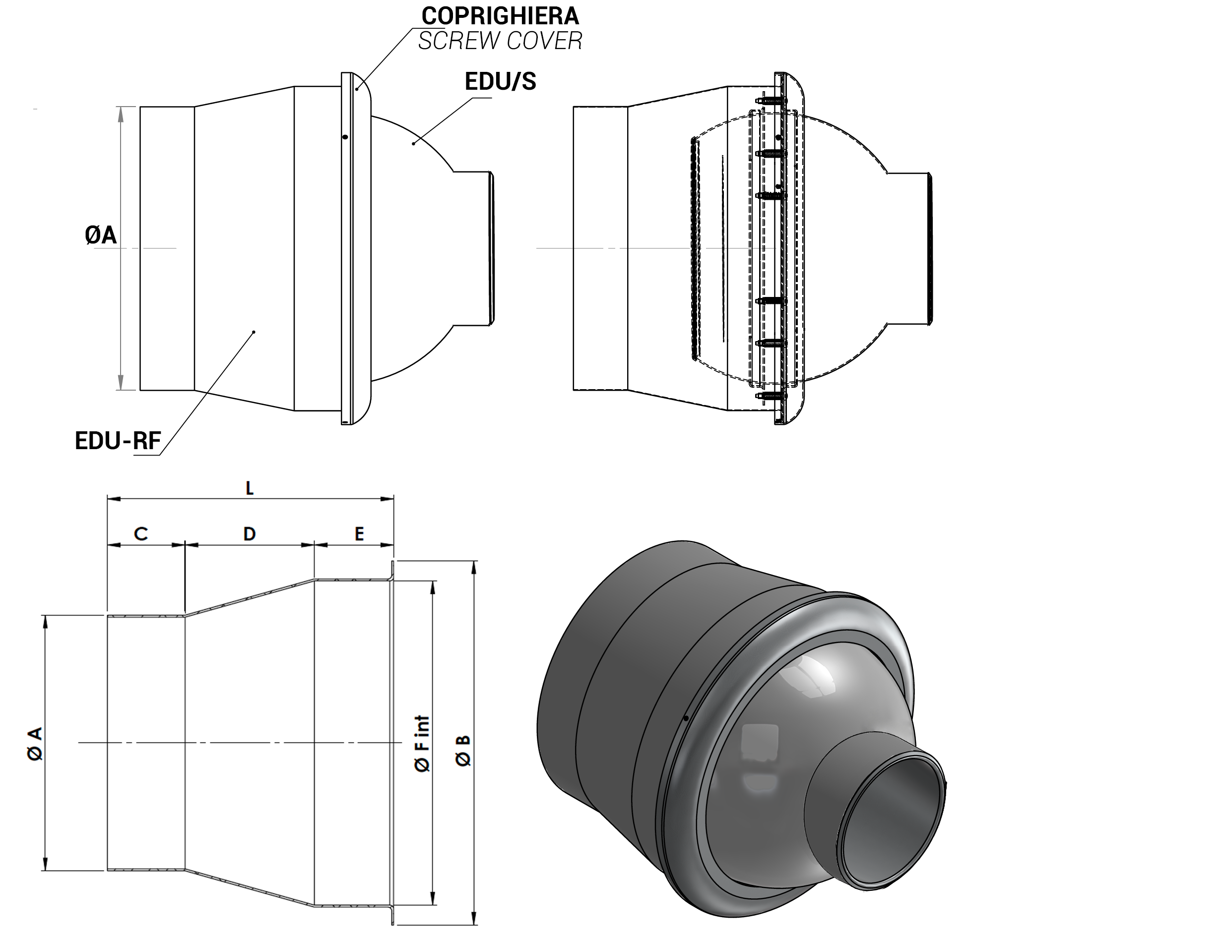 | Modello | EDU/S ugello con serranda | EDU/SM con predisp. x motoriz. | Servomotori per EDU/SM (fornito a corredo) | coprighiera | deflettore swirl | raccordo RF per tubo flessibile | raccordo RC per canale circolare | |||