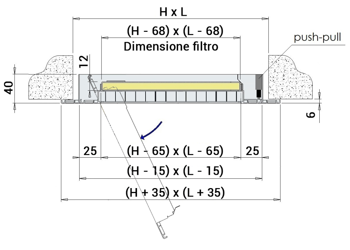 Griglia di ripresa a maglia quadra 13x13 mm da controsoffitto con doppia cornice ad apertura a cerniere e sistema push-pull per l'agevole alloggiamento e la sostituzione del filtro.