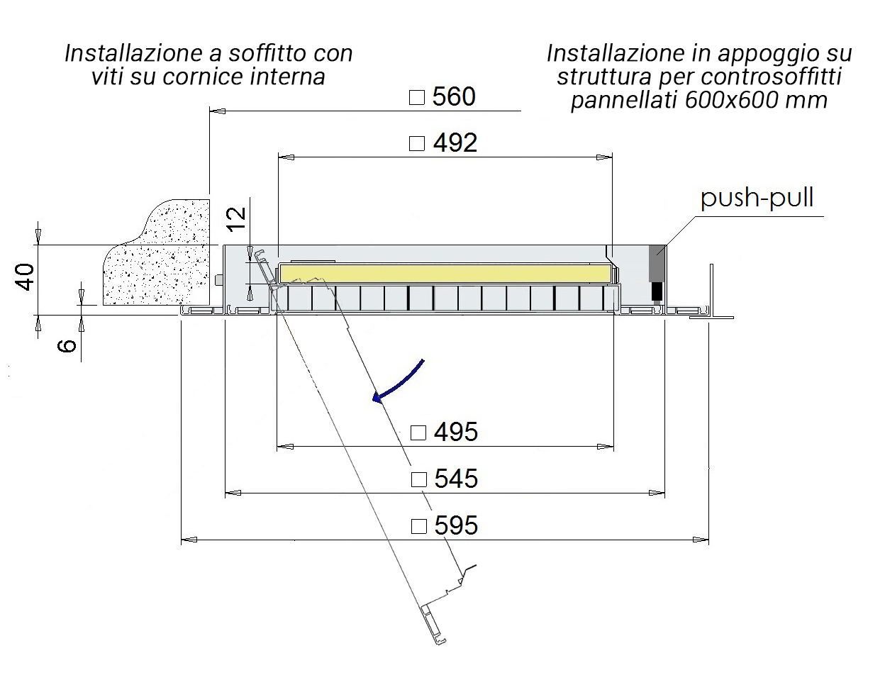 L'installazione viene eseguita fissando il telaio esterno della griglia al muro mediante viti o, per applicazione su controsoffitti modulari 600x600, in appoggio alla struttura metallica al posto del pannello.