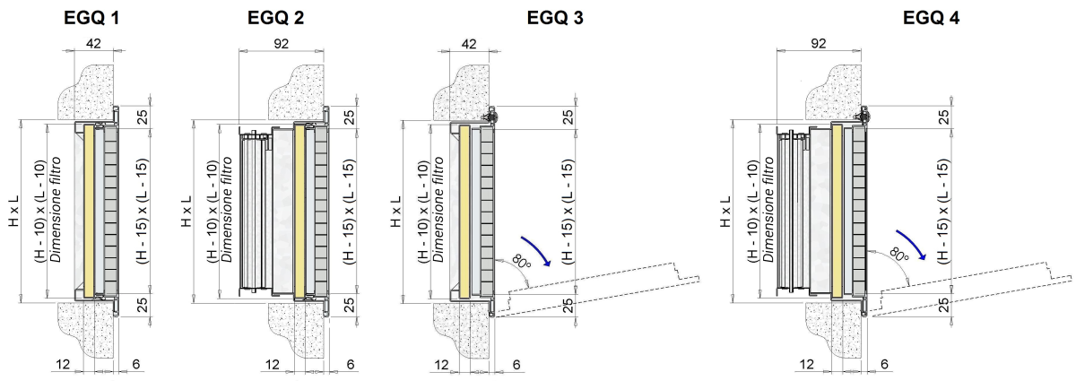 EGQ4: griglia con serranda e speciale controtelaio fissato con cerniere alla cornice che permette l'apertura di 80° per un'agevole manutenzione del filtro.