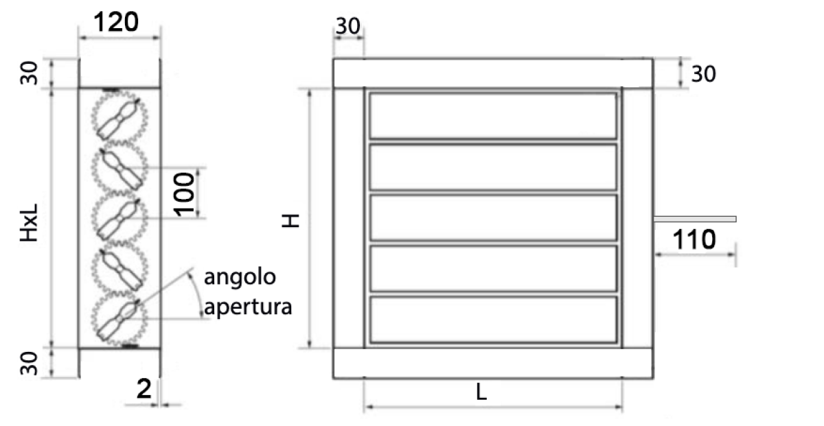 Serrande di regolazione con alette tamburate in alluminio a movimento contrapposto per mezzo di ingranaggi dentati protetti dal flusso dell’aria.