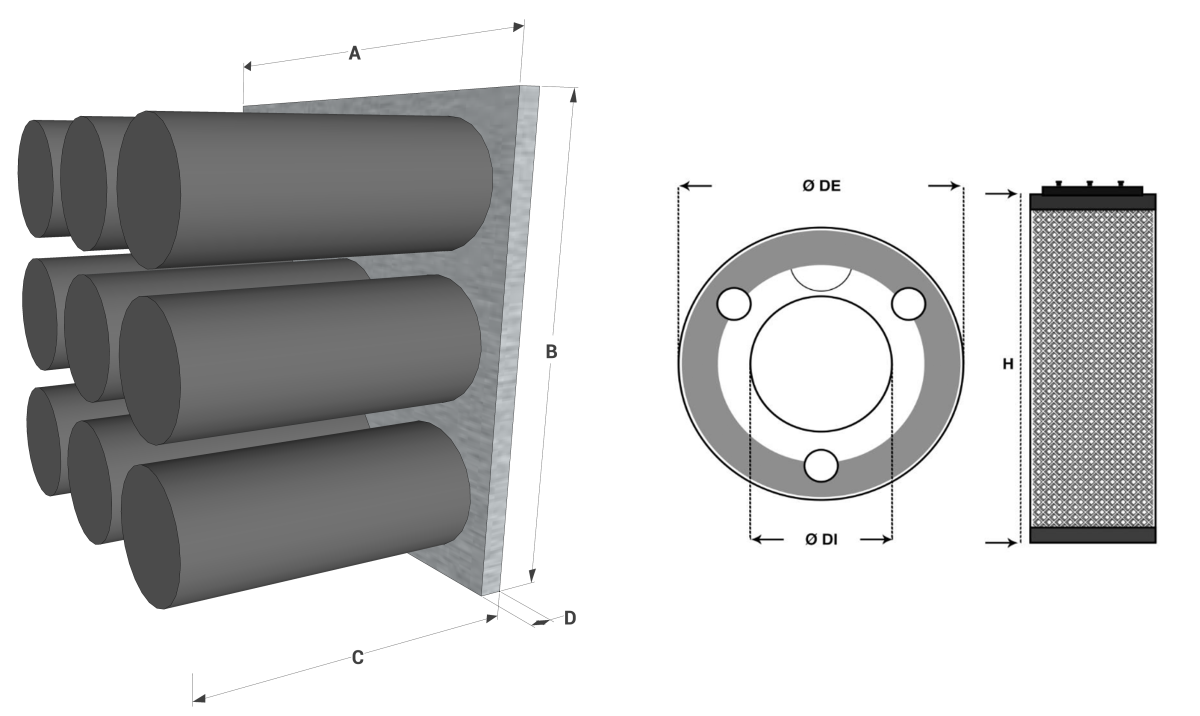 | Modello | dimensioniA x B x C | D | cartucce n° | Ø cartuccia | ØDE | ØDI | H | peso carbone kg | portata consigliata m3/h |