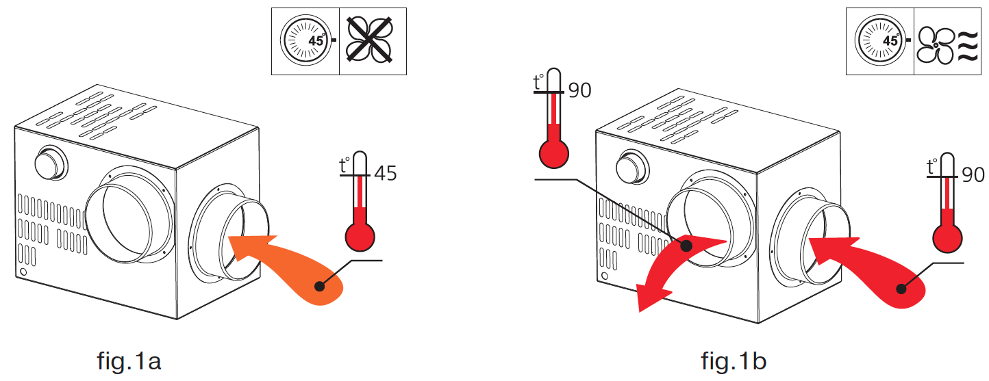 Il ventilatore si accende in automatico al raggiungimento del set point di temperatura impostato nel termostato (fig. 1b) e distribuisce l'aria da un locale ad un'altro. Il ventilatore si spegna quando la temperatura scende sotto il set point.(fig. 1a).