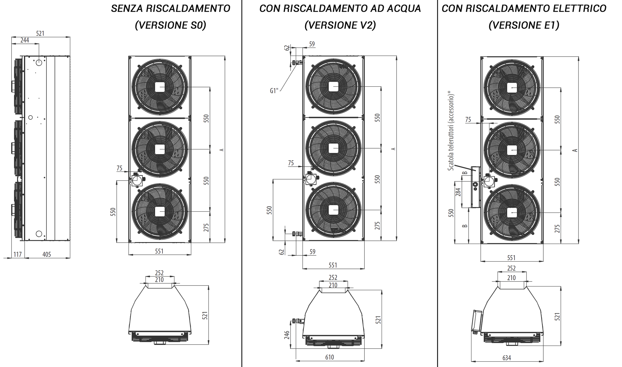-Riscaldamento ad acqua (V2), elettrico (E1) o senza riscaldamento (S0)