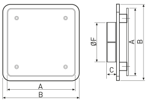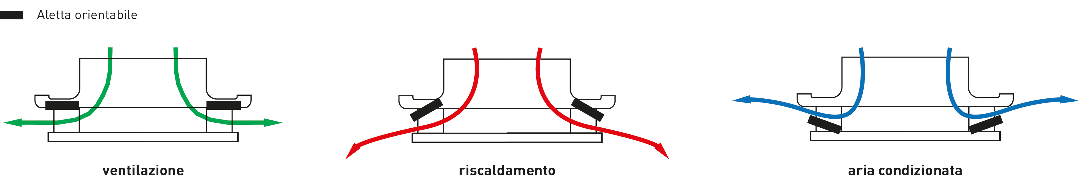 Diffusore d'aria in ABS bianco con attacco posteriore circolare, con deflettori mobili per regolare il lancio dell'aria sui 4 lati.