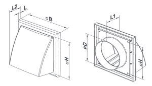 Bocchette di mandata o di ripresa in plastica da esterno, con cuffia antipioggia, complete di flangia per tubo circolare.