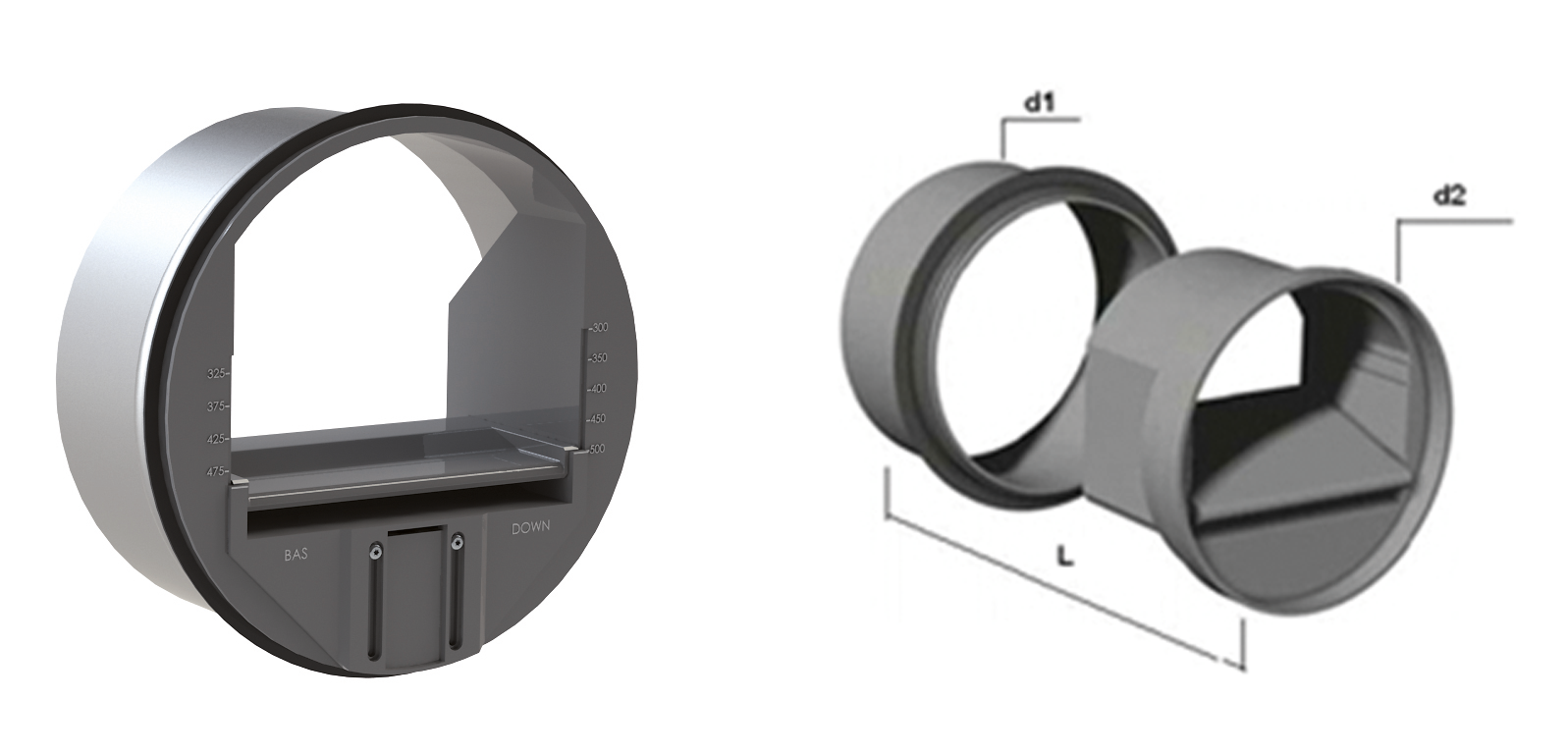Involucro in PVC per diametro 80 mm e acciaio zincato per diametro 125 mm, corpo interno per la regolazione dell'aria in PVC. Portata tarabile in fase di installazione.