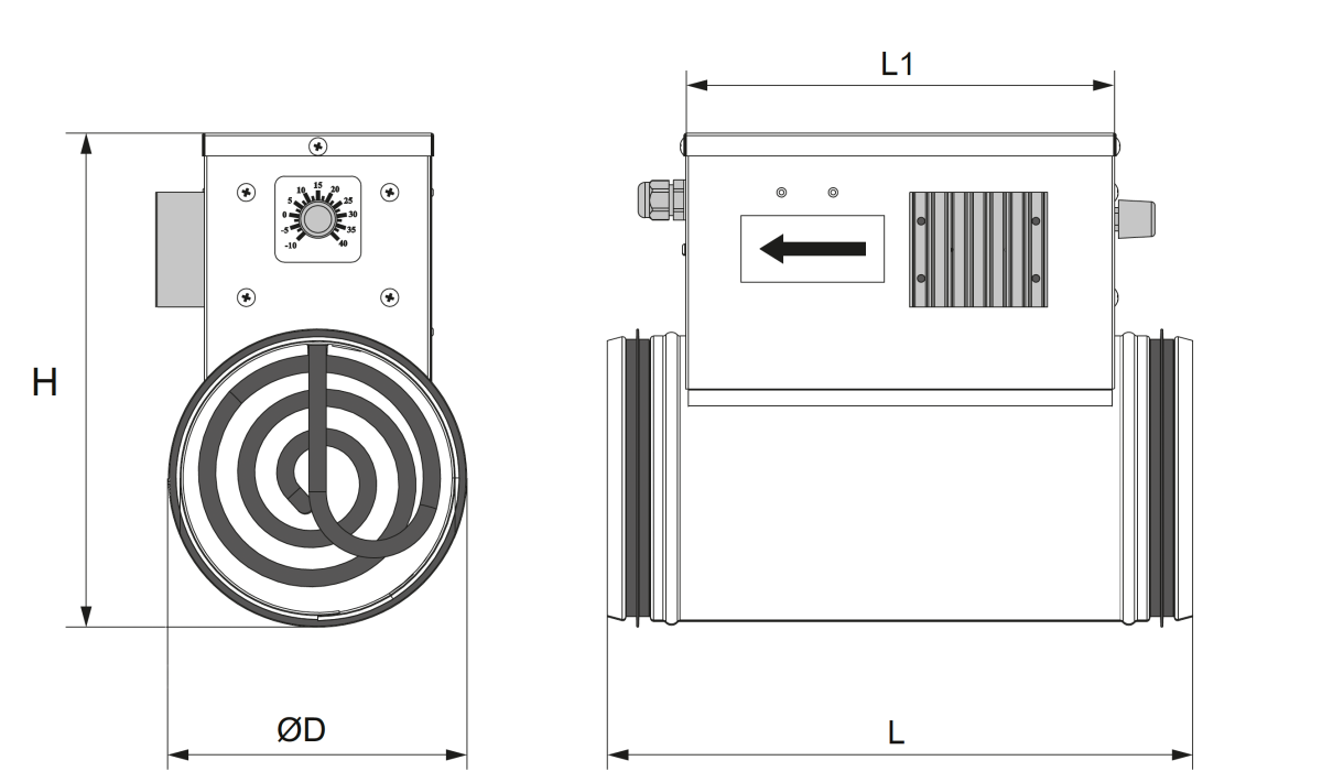 Sono predisposte di flange circolari che facilitano l'installazione sul condotto. La scatola laterale permette di accedere ai terminali per il cablaggio e contiene 2 termostati di sicurezza. La scatola elettrica è dotata di morsetti di alimentazione, relé per azionamento potenza e doppio termostato di sicurezza.
