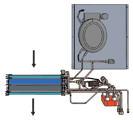 Durante il periodo inverale (compressore spento) la batteria idronica è alimentata con acqua calda proveniente dall'impianto di riscaldamento e si comporta come una termoventilante con recuperatore.