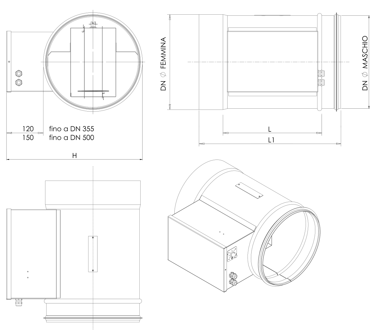 | Modello | portata aria m3/h | Alimentazione V / ph / Hz | Potenza (kW) | DN (mm) | L (mm) | L1 (mm) | H (mm) | peso (kg) | € |