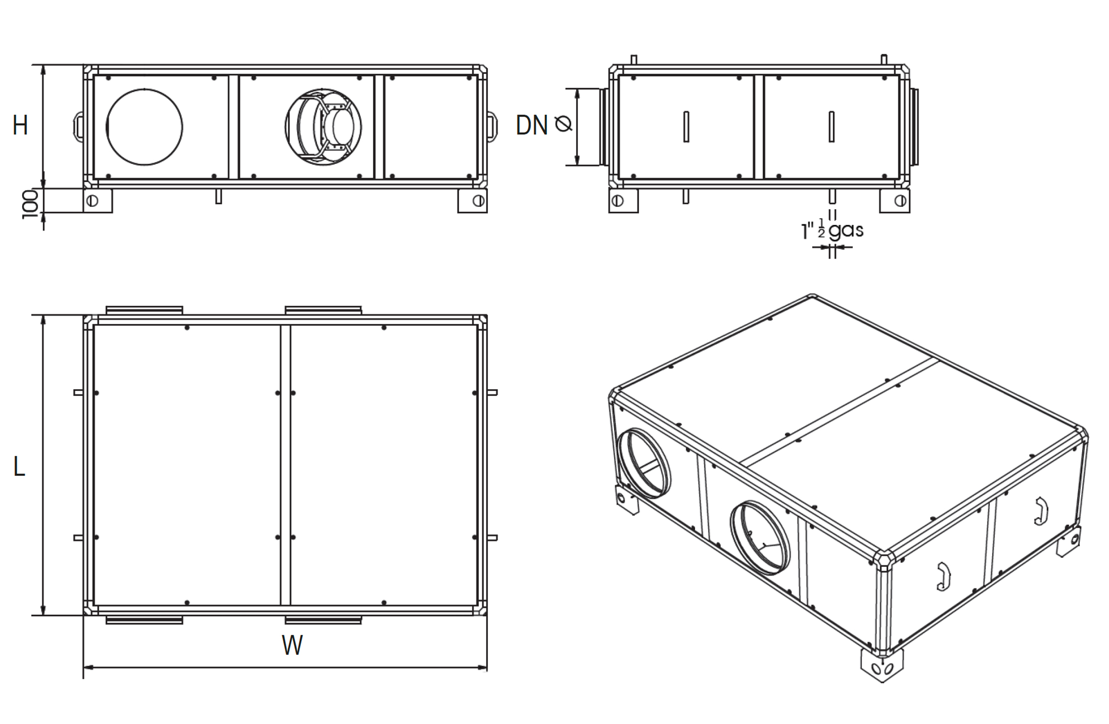 L'unità è composta da un monoblocco comprensivo di ogni componente per il corretto funzionamento: ventilatori, circuito frigorifero con compressori ad alta efficienza, sezioni di filtrazione aria e recuperatore di calore a flussi incrociati.