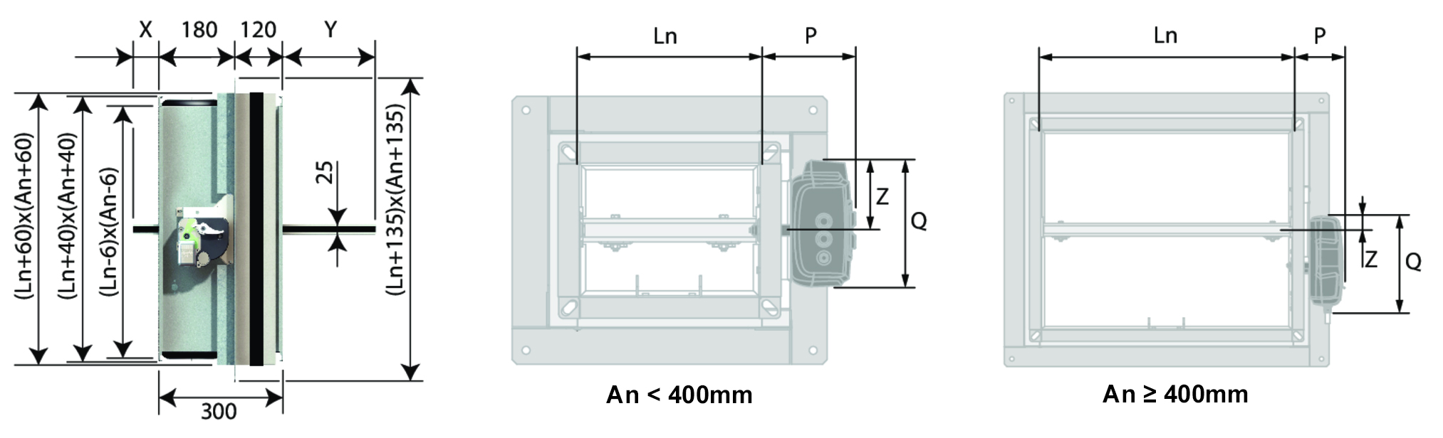 Any deviations from the instructions, affect the validity of the product certification and declaration of correct installation. The damper can be mounted with the axis horizontally or vertically built in the wall/floor or axis horizontally for remote mounting, as in the attached installation manual.