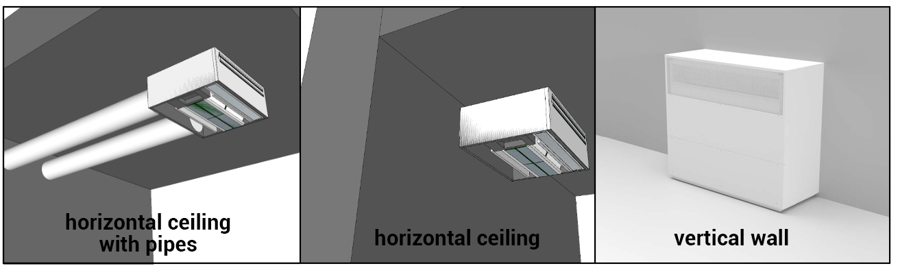 HORIZONTAL configuration: the unit can be installed close to the wall with the ducts pointing directly outwards or away from the wall with minimum ducting to reach the outside.