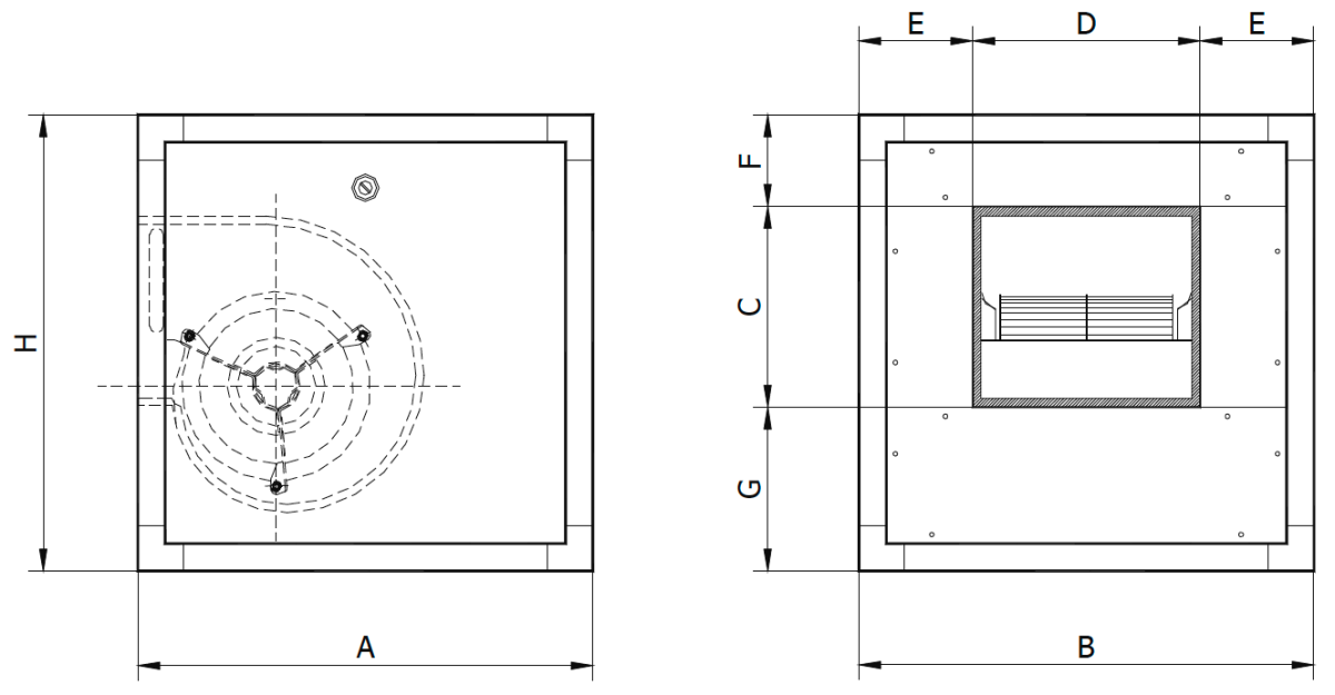 Temperatura di esercizio -20° +60°C,, porta di ispezione lato motore con chiusura a norme CE. Ventilatore del tipo centrifugo a doppia aspirazione del tipo direttamente accoppiato, montato su supporti antivibranti in gomma, giranti a pale curve avanti. Motore in esecuzione monofase 230V o trifase 400V, direttamente accoppiato, protezione IP54, classe F, conforme ErP.