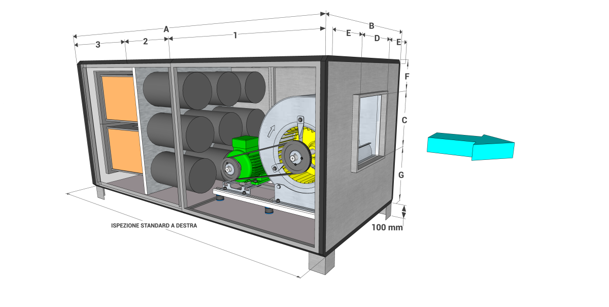 Ispezione filtri e ventilatore a sinistra.