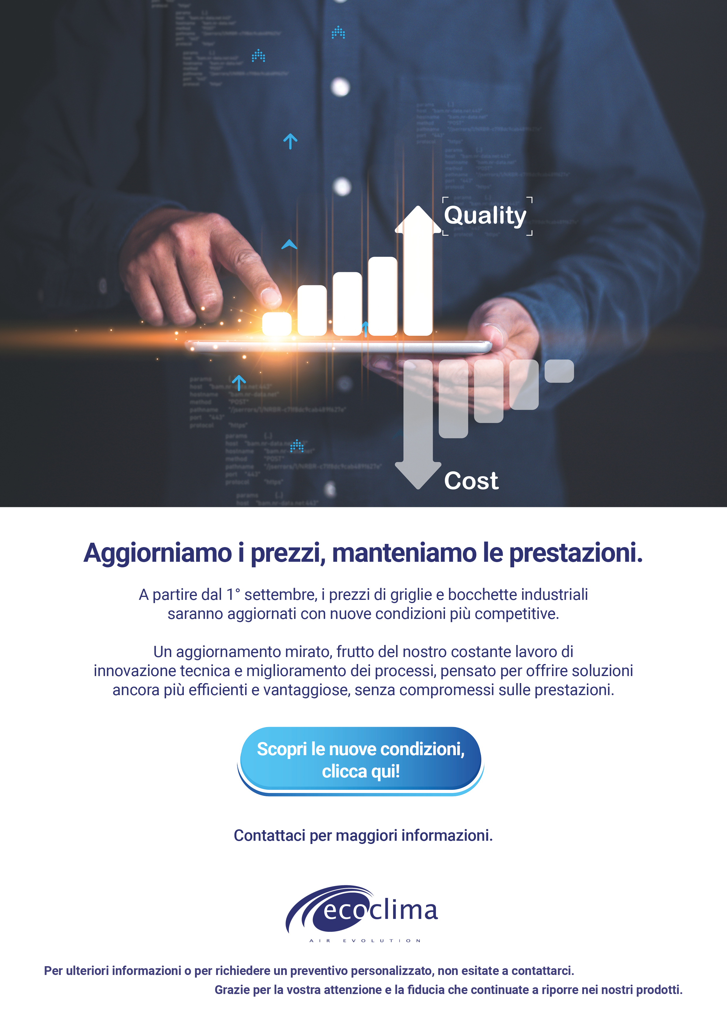 Dal 1° settembre i prezzi di griglie e bocchette industriali saranno aggiornati con condizioni più competitive. Un passo avanti frutto di innovazione e miglioramento continuo, per offrirti sempre il massimo.